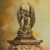 The UK artist Oliver Tupton produced a small (approximately 22cm high) sculpture based on this design. Resin casts were available in at least three colours: Ivory (off-white with golden snakes,) overall pewter and overall bronze finishes. |